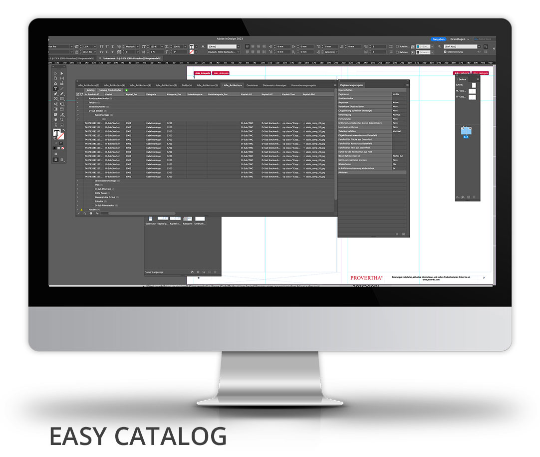 Über mehrere Jahre hinweg betreute ich den Export des PROVERTHA-Katalogs aus einem PIM-System, welches der Kunde mit Produktinhalten und Texten befüllte. Die Datenbank wurde exportiert und floss unter Verwendung der EasyCatalog-Software für InDesign in den Katalog ein. Einfach ausgedrückt, jedoch handelt es sich um einen recht komplexen Vorgang, aufgrund der Kategorisierung und Sprachwechsel.